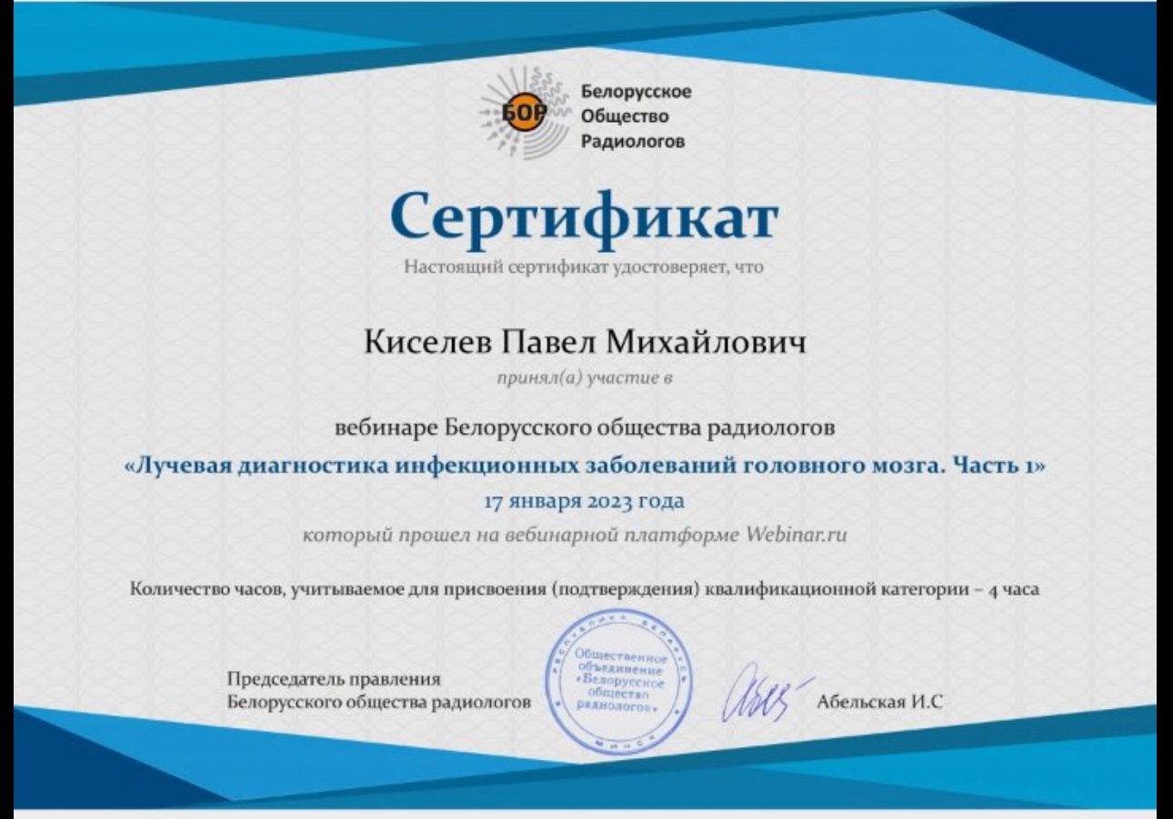 2023 г. - Вебинар Белорусского общества радиологов "Лучевая диагностика инфекционных заболеваний головного мозга".
